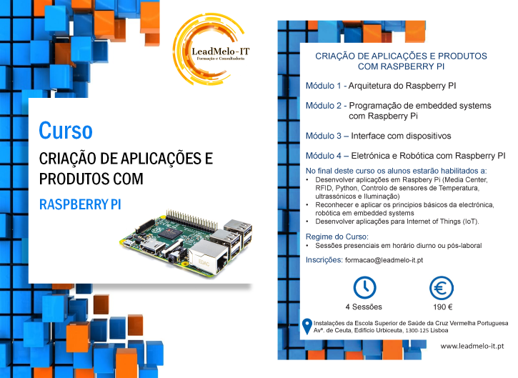 Curso para criação de aplicações e produtos com Raspberry Pi, irá permitir, conhecer a arquitetura do sistema, desenvolver aplicações, reconhecer e aplicar os principios básicos da electrónica, robótica em embedded systems e desenvolver aplicações para Internet Of Things (IOT).